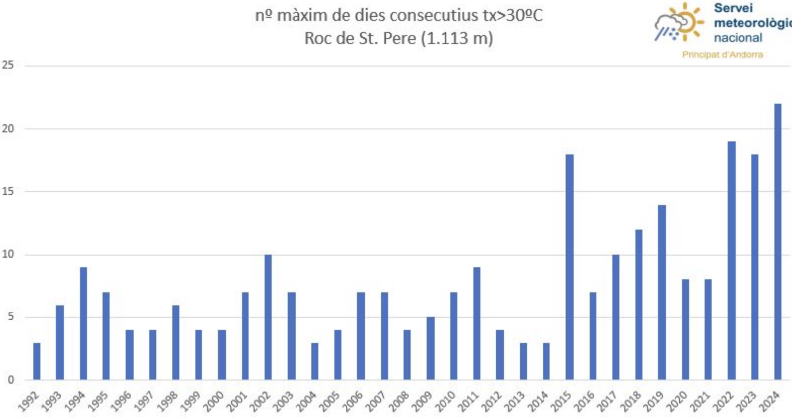 L’estació meteorològica de roc de Sant Pere ha tornat a registrar aquest dilluns els 30 graus i d’aquesta manera, s’ha batut un rècord en aquest observatori. Així, segons informen des del servei meteorològic a través de xarxes socials, es tracta del 22è dia acumulat que l’estació supera aquesta temperatura, i d’aquesta manera supera el rècord anterior, que es va registrar el 2022 i que va ser de dinou dies seguits.